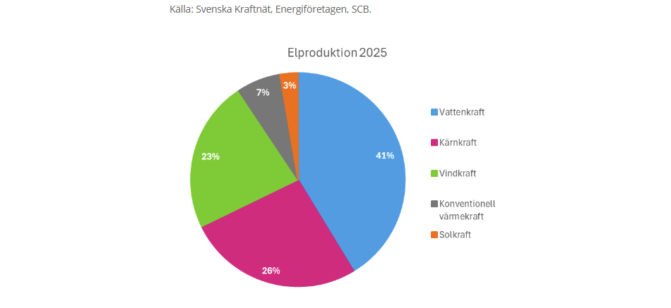 Fotnot: Samtliga elproduktionssiffror är preliminära och kan komma att ge ett något annorlunda utfall när den officiella statistiken publiceras i februari. Solelen inkluderar egenförbrukning och mikroproduktion genom schablonberäkning och uppskattningen baseras på SCBs officiella statistik.